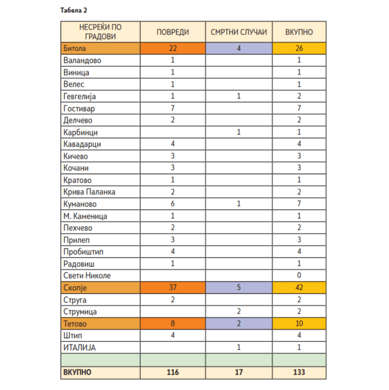 Најголемиот број на несреќи се случиле во Скопје, следено од Битола и Прилеп. Од вкупно 34 градови, несреќи се евидентирани во 23.