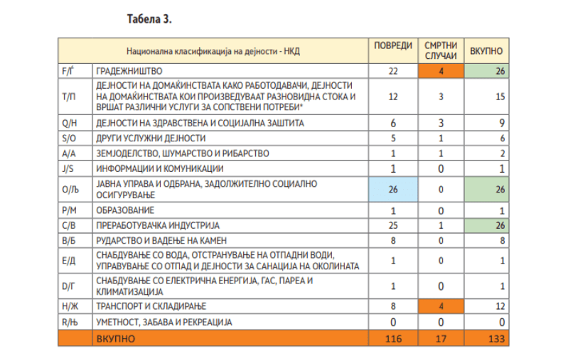 Меѓу дејностите со најмногу смртни случаи се градежништвото и транспортот, секоја со по 4 загинати, а веднаш зад нив се домаќинствата како работодавачи – со 3 смртни случаи. Последната категорија во најголем дел се однесува на несреќи при земјоделски активности и градежни интервенции на приватни имоти, најчесто со земјоделска механизација, како трактори.