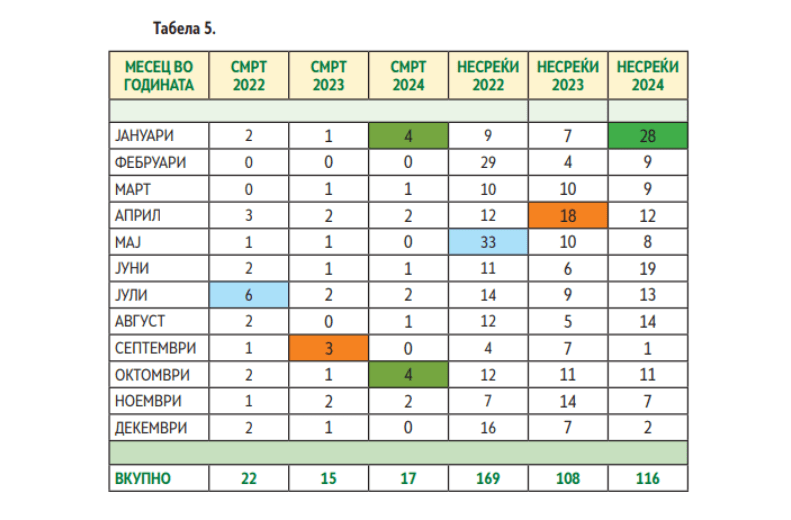 Стапката на смртност изнесува 2,45 загинати на секои 100.000 вработени – што претставува благ пораст во однос на 2023 година, кога стапката изнесувала 2,16. „Се проценува дека реалната бројка на потешки несреќи е далеку поголема од пријавената, поради недоволна евиденција и транспарентност“, велат од МЗЗПР.