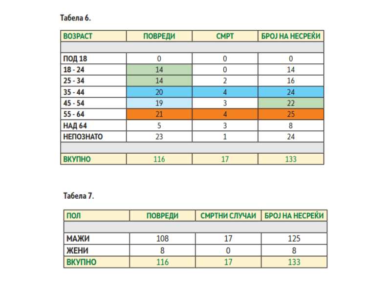 Извештајот открива дека најмногу несреќи се случувале во вторник, додека месецот со најмногу инциденти бил јануари. Возрасната група која најчесто страдала од повреди е од 55 до 64 години, а речиси сите несреќи ги доживеале мажи.